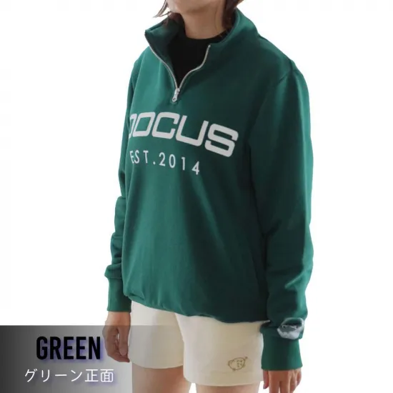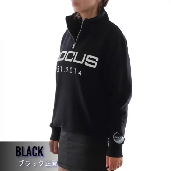 首元までしっかり閉じるハーフジップ仕様で、気温やスタイルに応じて調節可能な1着。